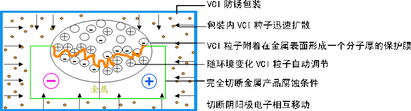 VCI是英文(Volatile Corrosion Inhibitor)的縮寫,它是一種具有揮發(fā)性的腐蝕抑制劑,簡稱為氣化性防銹產(chǎn)品。當(dāng)用氣化性防銹產(chǎn)品包裝好被包裝物以后,防銹產(chǎn)品的防銹粒子氣化成氣體,吸附在金屬表面形成保護(hù)膜,切斷金屬離子與水、氧氣接觸的可能性,有效抑制了金屬腐蝕電化學(xué)反應(yīng)的發(fā)生,從而達(dá)到防銹效果。包裝后內(nèi)部的防銹粒子的氣化擴(kuò)散量自動調(diào)節(jié),當(dāng)濕度或溫度增大時,防銹粒子的擴(kuò)散量也會加大, 反之,防銹粒子的擴(kuò)散量會減小,從而來自動調(diào)節(jié)包裝物內(nèi)部的氣體濃度,讓包裝物始終處于一種最穩(wěn)定的防銹狀態(tài)。